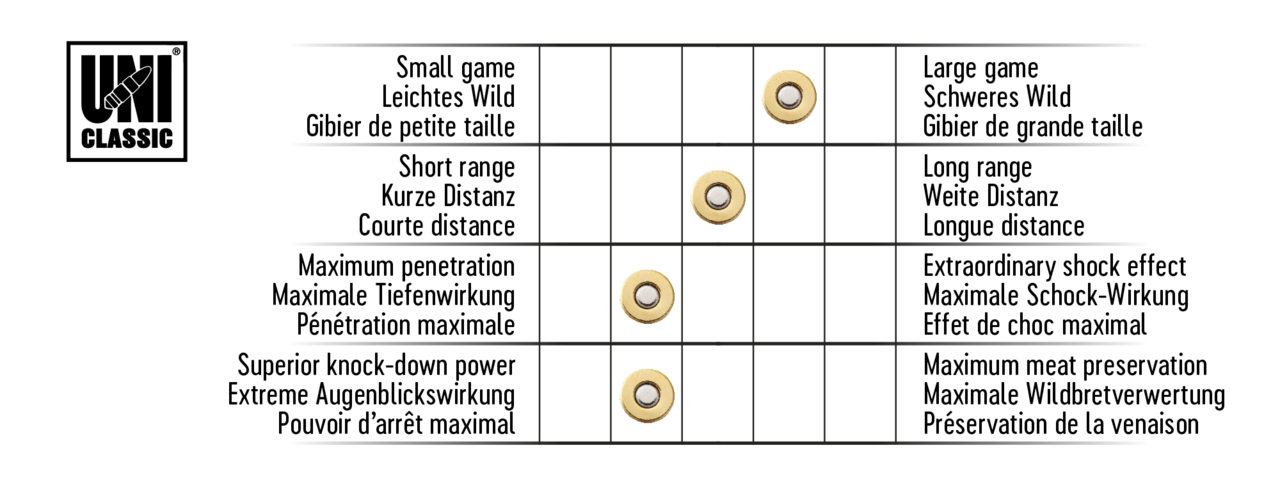 The UNI Classic bullet was developed especially so that it would be capable of hunting heavy hoofed game up to large game – a counterpart to the ID Classic. The harder and heavier rear core has less tendency to mushroom, which further increases penetration. Like the ID Classic, the front core fragments reliably, which assures great shocking power upon impact. The torpedo-shaped boattail ensures stability in flight.